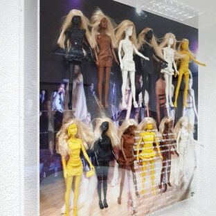 Konzept Kunst Tagebuch. Barbie Puppen Acryl bemalt 3D Glaskasten 1 x 1 Meter Siebdruck