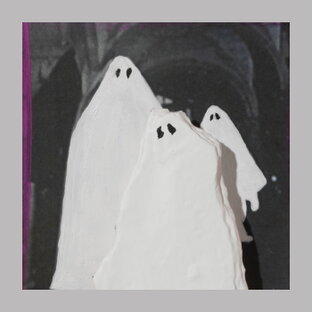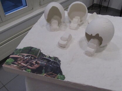 Installation 50 x 50 cm Holz. Foto, Modelliermasse, Acryl bemalt